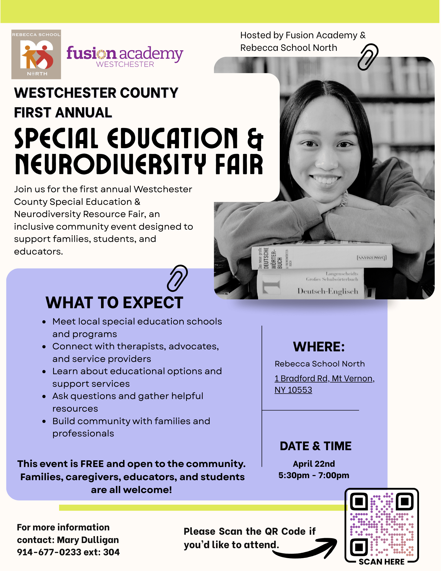 Join us for the first annual Westchester County Special Education & Neurodiversity Fair, an inclusive and engaging community event hosted by Fusion Academy Westchester and Rebecca School North. This free event is designed to support families, students, and educators by bringing together a wide range of local resources in one space.